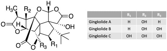 The Gingko biloba tree is native to China and is the oldest living tree species. In western medicine, Gingko leaf extracts have been used for the last several decades to increase peripheral and cerebral blood flow as well as for the treatment of dementia. The extract of Ginkgo biloba leaves contains flavonoids and terpene tri-lactones. The flavonoids consist of flavone and flavonol glycosides, acylated flavonol glycosides, biflavonoids, flavane-3-ols, and proanthocyanidins. See Figure 4 for the structure of selected terpene tri-lactones (gingkolides) found in the Gingko biloba plant. Gingko seeds are used in Traditional Chinese Medicine to treat skin infections (topical antimicrobial). Present-day studies have shown that Ginkgo seed extracts protect against gram-positive skin pathogens: Cutibacterium acnes, Staphylococcus aureus, and Streptococcus pyogenes [29].