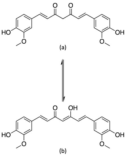 Molecular structure of curcumin, the chief component of turmeric. At low pH, it primarily exists in the (a) keto form, which tautomerizes to the (b) enol form at higher pH.