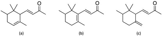 Molecular structure of (a) α-, (b) β-, and (c) γ-irones which are responsible for the characteristic fragrance odor of orris root oil.