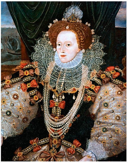 Queen Elizabeth I of England (see Figure 10) is probably one of the most well-known historical figures that used Venetian ceruse to whiten her face. As a child, she had smallpox, which in sixteenth-century Europe had a mortality rate of 30%, leaving her deeply scarred for life. For this reason, she used ceruse and other preparations, giving her an almost clown-like appearance. Maria Coventry, Countess of Coventry (1733–1760 AD) and London society hostess, was another known figure during this period who was afflicted with the negative consequences of using lead carbonate-based cosmetics. At the age of 28, the Countess of Coventry died from lead poisoning [81]. Often, the use of ceruse led to the formation of eruptions on the skin, which women tried to cover up by applying more ceruse, thereby creating a vicious cycle.
