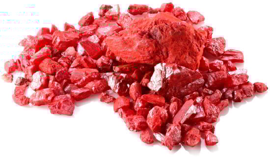 Queen Elizabeth I was also known for wearing lipstick containing cinnabar as well as applying cinnabar to the cheeks to obtain a rouge effect. Cinnabar is a mercury sulfide mineral (Figure 11). It is the most common ore used to obtain refined elemental mercury. Overexposure to mercury leads to neurotoxicity, which affects the body’s nervous system. Cinnabar has been used in Traditional Chinese Medicine and Ayurveda for thousands of years; however, in today’s health-conscious environment, there certainly are concerns about its toxicity [84]. Nowadays, some commercial color cosmetics (e.g., lipstick) brands use the word cinnabar as a description of the makeup color.