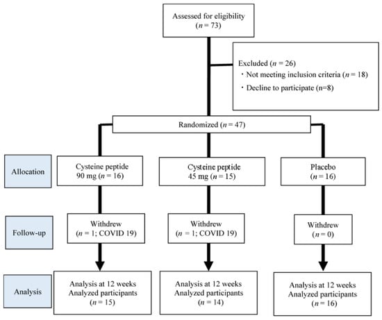 APA StyleUchida, Y., Kaneda, T., Ono, M., Matsuoka, M., Nakamura, U., Ishida, A., Yamasaki, Y., Takeo, H., & Sakurai, T. (2023). The Effect of Cysteine Peptide Ingestion on Skin Brightness, a Randomized, Double-Blind, Placebo-Controlled, Parallel-Group Human Clinical Trial. Cosmetics, 10(3), 72. https://doi.org/10.3390/cosmetics10030072