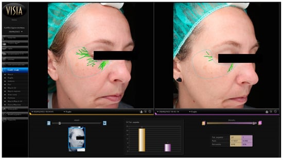 Table 2 shows the results at baseline (T0) compared with after 30 days (T60) from the end of the treatment. All three of the VISIA values, namely the feature count, score, and percentile related to the wrinkle criterion, are reported. The values decreased over time in six out of eight patients, with an average value of −22.1%, while the absolute score decreased over time in seven out of eight patients, with an average value of −34.9%. The value of the percentile increased over time in six out of eight patients, with an average value of +32.8%. The reduction in wrinkles and the improvement in the appearance of the remaining features are summarised in Scheme 1 and highlighted in Figure 1, Figure 2 and Figure 3. These data confirm the efficacy of the non-invasive FLE treatments assessed in this trial for overall rejuvenation of facial skin, with a focus on wrinkles and an evaluation via the specific VISIA algorithms.