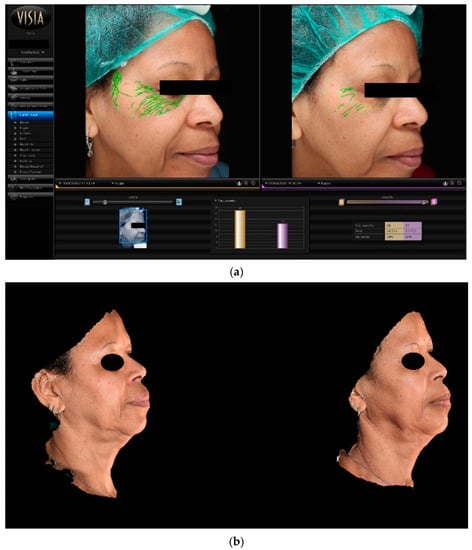 (a) Patient 5: 59 years old; skin type V. VISIA wrinkle mask images before (T0, left) and 1 month after the last session of the FLE treatment (T60, right); (b) Patient 5; QUANTIFICARE 3D images before (T0, left-hand 3D image) and 1 month after the last session (T60, right-hand 3D image).