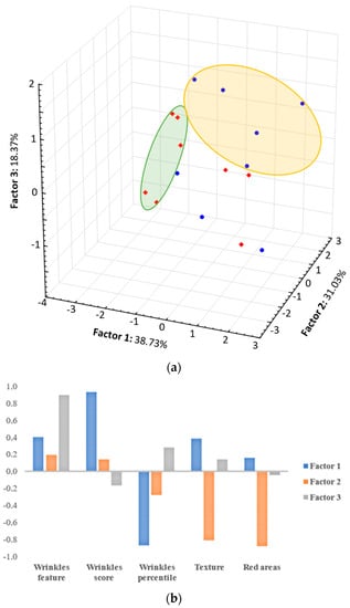 To corroborate this result, a PCA analysis was conducted only on the normally distributed VISIA parameters. Scheme 1a illustrates the tridimensional PCA score of the three factors accounting for 88.13% of the total variance explained, which shows how the eight patients before and after the FLE treatment were rather clearly clustered, mainly along Factor 1, which was more correlated to the wrinkle score and the percentile having positive (0.9302) and negative (−0.8650) factor loadings, respectively (Scheme 1b). Texture and red areas made negative contributions to Factor 2 (−0.8084 and −0.8755, respectively) and, to a lesser extent, on Factor 3, wrinkles also contributed to the ability to discriminate between the two groups. This means that treated patients tended to present a decrease in the wrinkle score and percentile, and an improved texture with reduced red areas.