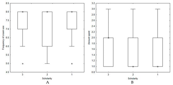 (A) Box plot of the frequency of cosmetic cream use and amount spent based on level of scholarity. Frequency: (8) more than once a day; (7) daily; (6) several times a week; (5) weekly; (4) several times a month; (3) monthly; (2) less than monthly; (1) never. (B) Amount spent: (1) less than USD 10.9; (2) USD 10.9–21.7; (3) more than USD 21.7. Scholarity: (1) secondary (high school); (2) tertiary (post high school); (3) postgraduate. Median: □; 25–75% of the observations: ⃞ ; non-outlier range: ɪ; outlier (extremely high and low values): °.