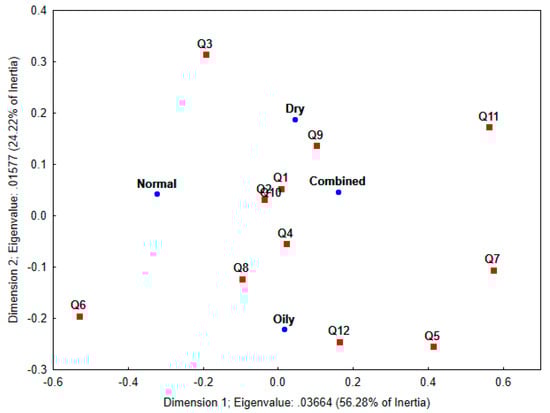 The first two dimensions of the biplots described, from 66.65% to 100%, the correspondence between the characteristics of respondents and the CATA sentences. The lowest variances explained by the first two dimensions were for biplots generated from the skin-related variables (Figure 4, Figure 5 and Figure 6). Results from other biplots showed greater variances. The analysis showed important results related to sociodemographic traits and the perceptions of natural and eco-friendly cosmetic cream products.