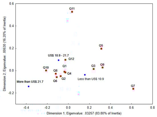The exploration of the age variable (Figure 7, variance of 100%) showed that older women are more concerned about the use of cosmetic creams that are 100% natural. Conversely, younger ones do not care how many ingredients the cream has aside from affirming that they feel bothered that the creams have natural ingredients. For the amount spent (Figure 8, variance of 100%), women that spent less than USD 10.9 were linked with the statements that reveal that they do not care how many ingredients the cream has; they do not pay attention to the composition of the creams they use; but it bothers them that creams have natural ingredients. With the group that spent USD 10.9–21, the other statements corresponded better. This group revealed a positive perception about the use of natural and eco-friendly creams.