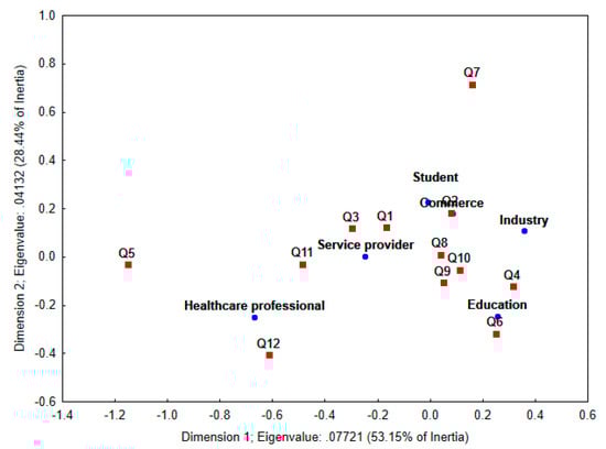 The scholarity data (Figure 9, variance of 100%) showed that only the postgraduate women presented a concern about natural and eco-friendly creams, noting once more a lack of awareness of these issues. Nonetheless, the lack of knowledge about possible adverse health effects caused by the use of parabens and petroleum derivatives highlights a lack of knowledge by the participants, as even those with more education (postgraduate) were linked to this statement. This issue becomes more evident with the analysis of Figure 10, where not even healthcare professionals knew about the relationship between cosmetic creams and adverse health effects. Still, the results from this biplot are worth mentioning given the importance of natural cosmetics to educated professionals.