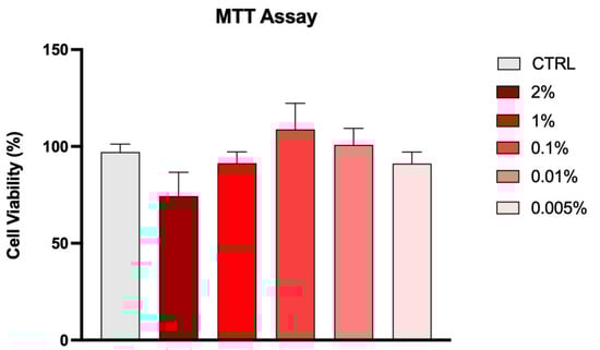 Human fibroblasts (C0135C, Thermo Fisher Scientific, Waltham, MA, USA) were expanded up to passage 3, then culture medium was added with Venerinase® at different concentrations for 24 h to subsequently determine a suitable working dose without affecting cell viability and proliferation. To this purpose, human fibroblasts underwent a 3-(4,5-dimethylthiazol-2-yl)-2,5-diphenyltetrazolium bromide (MTT) colorimetric test []. With regard to this, cells were incubated for 3 h with MTT reagent at 37 °C. After incubation, the purple formazan crystals were dissolved in DMSO at room temperature, then the absorbance was measured at OD = 590 nm by using a multi-well plate reader (Thermo Scientific Appliskan, Thermo Fisher Scientific). The determined working concentration was applied for 24 h to fibroblast cultures, then cells underwent UV irradiation at a dose of UVB of 50 mJ/cm2 (Philips—TL 20W/12RS, 270–420 nm) [,].