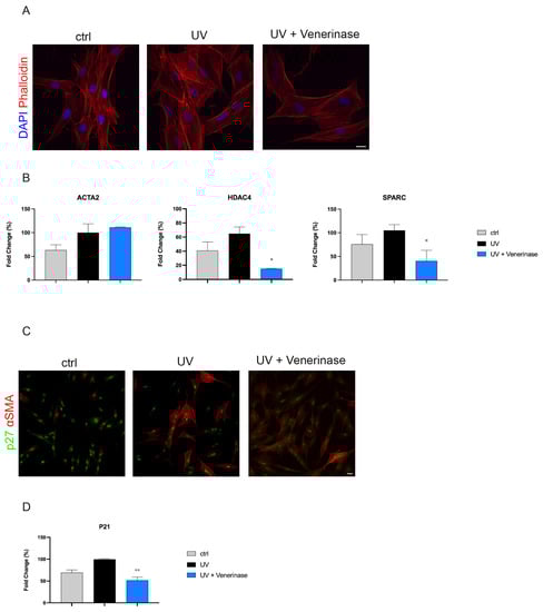 Moreover, Venerinase®-pretreated fibroblasts displayed a reduced α-SMA expression, with a parallel increase in P27 compared to non-treated UV-exposed cells, therefore suggesting Venerinase® possibly prevents the acquisition of a pro-fibrotic phenotype (Figure 2C).
