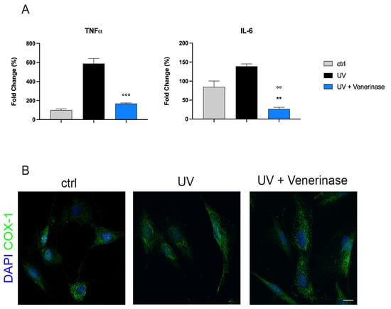Inflammatory cytokines and oxidative stress in human fibroblasts after Venerinase® pre-treatment and UV exposure. (A) Real-time PCR analyses of inflammatory cytokines TNFα and IL-6 in human fibroblasts. Histograms report the percentage fold change in mean values of mRNA levels ± standard deviation (SD). One-way analysis of variance (ANOVA) followed by Newman–Keuls post hoc test. °° p < 0.01, °°° p < 0.001 vs. UV; ** p < 0.01 vs. ctrl. (B) Confocal immunofluorescence analysis of COX-1. Nuclei were counterstained with DAPI (blue). Scale bar: 10 μm.