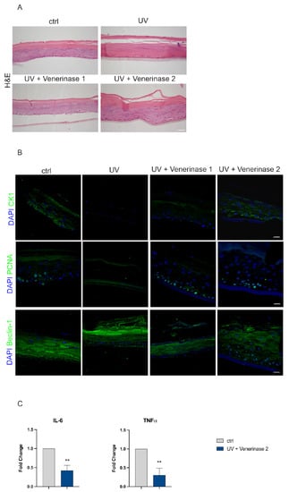 Protective effects of Venerinase® pre-treatment on UV-exposed epidermis. (A) Histological analysis of EpiDerm samples from each experimental group. H&E staining showing the effects of Venerinase® pre-treatments (Venerinase® 1, corresponding to t0 administration and Venerinase® 2 corresponding to t0 and t24 h administration) on UV-irradiated EpiDerm stratification. Scale bar: 50 μm. (B) Confocal analysis of CK1, PCNA and beclin-1. Nuclei were counterstained with DAPI (blue). Scale bar: 20 μm. (C) Real-time PCR analyses of IL-6 and TNFα in UV-exposed EpiDerm previously treated with a double dose of Venerinase®. Histograms report the fold change in mRNA levels indicated as means ± standard deviation (SD). One-way analysis of variance (ANOVA) followed by Newman–Keuls post hoc test. ** p < 0.01 vs. ctrl.