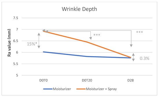 After 20 min of product application, the average roughness in the area treated with Moisturizer + Spray significantly decreased, with an average of 7% compared to the baseline measurement (p < 0.001). The long-term anti-wrinkle effect, observed 28 days after continuous product use, showed a significant decrease in the average roughness of the area treated with Moisturizer + Spray, with an average reduction of 17% compared to the baseline measurement (p < 0.001) (Table 3, Figure 1 and Figure 2).
