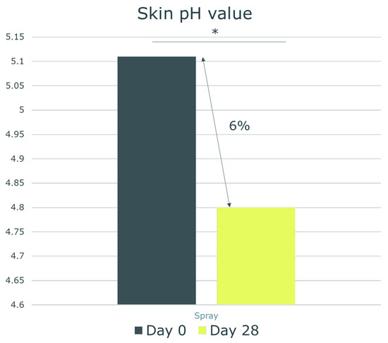 The skin pH in the area treated with Moisturizer + Spray showed a significant average decrease of 6% compared to the baseline measurement after 28 days of continuous product use (p < 0.05) (Figure 3). The average skin pH level reached a value of pH < 5.