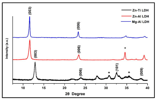 The XRD patterns for the different LDHs (Figure 1) indicate that all three LDHs are crystalline materials and exhibit the characteristic reflections of LDH with planes (003), (006), and (009) [4,27]. As seen in Figure 1, the (003) basal reflection, the most intense reflection, is indicative of the LDH structure. This reflection typically occurs at approximately 2θ = 11.7° corresponding to a d-spacing of 7.6 Å for natural and synthetic LDH with carbonate anion in the interlayer space, and this was consistent with findings for Zn-Al and Mg-Al LDH (Figure 1) [5,14,28]. However, the (003) basal reflection was moved to 2θ = 12.88° (d003 = 6.85 Å) for Zn-Ti LDH. As explained in our previous work [9], this shift was due to the incorporation of Ti4+ into the LDH structure. The shift in 2θ angle was complemented by an overall decrease in the basal spacing, which may be associated with the strong electrostatic interactions existing between the carbonate interlayer anion and the host layer [5]. The presence of Ti4+ in Zn-Ti LDH results in less repulsion between the layers in comparison to the LDH containing Al3+, allowing stronger electrostatic attraction between the anion and cation which draws the layers closer [14]. Peaks observed at 2θ ≈ 32° and 35.7° (peaks marked with “+” sign) correlate to Zn(OH)2 as substantiated by PDF card 00-020-1437 [5].