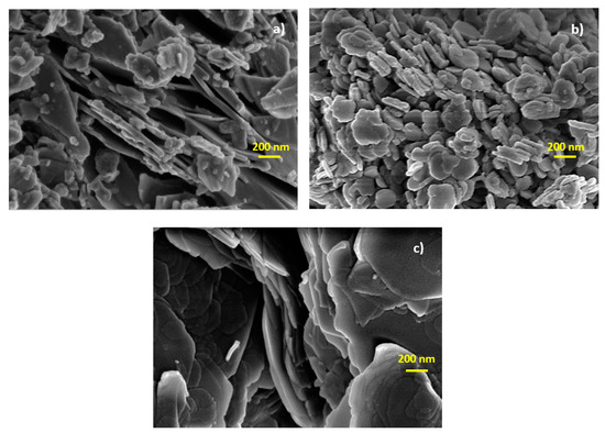 The SEM micrographs in Figure 2 show the morphology of different LDH indicating the apparent effect of different metal cations in the LDH matrix. As seen in Figure 2a, the Zn-Ti LDH showed the highest prevalence of flake-like structures among all three samples, and the structure of these flakes was more defined in comparison to the other LDH. These flakes were stacked in an orderly manner, with an average length of 200–300 nm. They clearly exhibited the hierarchical structure of the LDH containing interlayer pores of varied sizes. The presence of these flakes to form a porous structure correlated well with the work described by Shao et al. [5].
