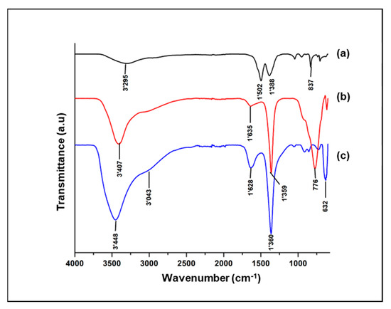 FTIR provided information about the interlayer anions present in each of the LDH. Figure 3 shows the FTIR spectra for Zn-Ti LDH, Zn-Al LDH, and Mg-Al LDH. As seen in Figure 3a, the broad peak occurred at approximately 3295 cm−1, a slight shift from the expected values in the literature; however, this still corresponded to the OH stretching mode due to intercalated water in the LDH layers [33,34]. In Figure 3b,c, the OH stretching mode was at 3407 cm−1 and 3448 cm−1, respectively. The shift observed for the Zn-Ti LDH could be ascribed to the integration of a tetravalent ion into the structure [9]. The electronegativity value of Ti4+ is 1.59, in comparison to the electronegativity of Al3+, which is 1.50. This difference in electronegativity affects the electron density on the O-H band (M-OH), thereby causing a shift to lower wavenumbers [14,35]. Furthermore, Zn-Ti (Figure 3a) LDH exhibited peak broadening of the OH stretching band, which may be due to the coordination of the OH groups to Ti4+ [14,34].