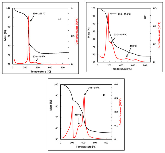 Dependent on the nature of the cations incorporated, oxidation or reduction (redox) processes may occur during heating. In the absence of redox processes, thermal decompositions are known to occur in four steps: (1) loss of surface adsorbed water, occurring below 80 °C; (2) removal of interlayer water; (3) dehydroxylation; and (4) removal of interlayer anion [41,42].
