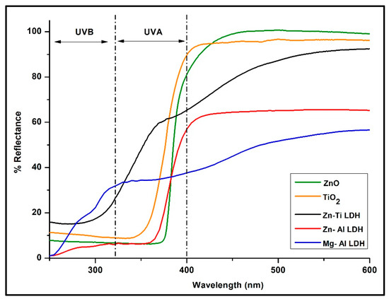 It is noteworthy that the UVA reflectance of Zn-based LDH was higher than that of Mg-Al LDH, which could be assigned to the presence of Zn2+ in the LDH structure [9,45]. The higher UVA reflectance exhibited by Zn-Ti LDH may be accounted for the synergistic effect of both Ti4+ and Zn2+ within the LDH structure [46,47,48,49]. It is also noticeable from Figure 5 that, in comparison to Zn-Al LDH (3.16%) and Mg-Al LDH (11.07%), Zn-Ti LDH (16.6%) showed greater capability for UVB reflectance as well. It may thus be concluded that the presence of Zn within the LDH structure improved the UV reflectance properties of the LDH. However, when we compare Zn-Ti and Zn-Al LDH, the incorporation of Ti4+ improved the overall UV reflection capacity further, particularly in the UVA range.