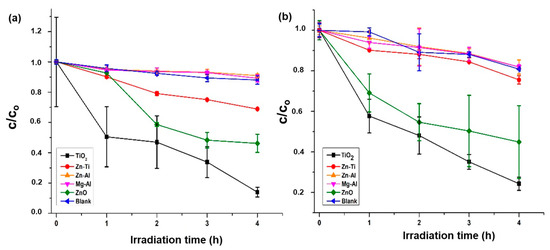 The photocatalytic properties of the synthesized LDH were analyzed by observing the photodegradation of MB over a period of 4 h. The inherent adsorption of MB on different LDH was measured prior to photocatalytic testing [50,51,52]. Only minimal surface adsorption of MB on LDH was observed in the absence of UV, and the equilibrium concentration were 0.013, 0.004, and 0.029 g/L, respectively, for Zn-Ti, Zn-Al, and Mg-Al LDH.