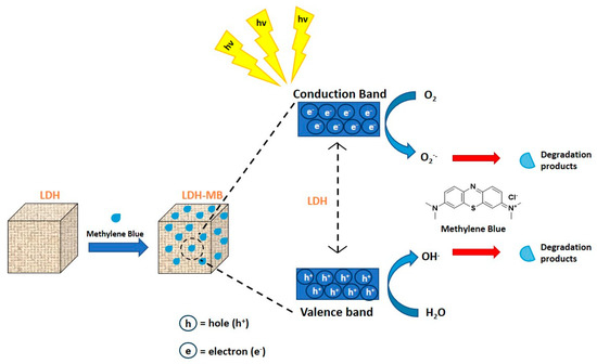 Proposed pathway of photocatalytic degradation of Methylene Blue by LDH.