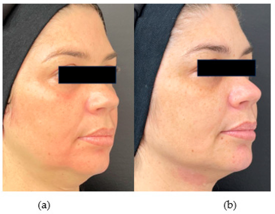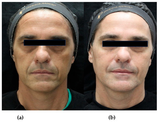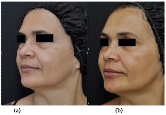 Many authors report the efficacy of fillers in promoting global facial rejuvenation using different types of HA gel, and this study corroborates this concept. Here, most patients had accentuated improvement with great satisfaction at 1, 3, and 6 months after treatment, despite different techniques, patients’ ages, and clinical assessments. Improvements could be observed after the first month and were sustained during follow-up (Figure 5a,b). The combination of three fillers, used according to their physicochemical properties, enabled these results. In this study, the physicians used the softest gel (S100 gel) to treat the perioral region, lips, palpebromalar groove, and temporal region. The strongest gel (S500 gel) was used to treat the lower face, mentum and mandible, and the middle face in some cases. The gel with intermediate rheological properties was mainly used in the middle face, but also in the lips. It is important to highlight the cohesivity of these gels, which is an essential characteristic for filling regions where gel integration is crucial for attaining good results and avoiding side effects, as reported by Lee et al. [14].
