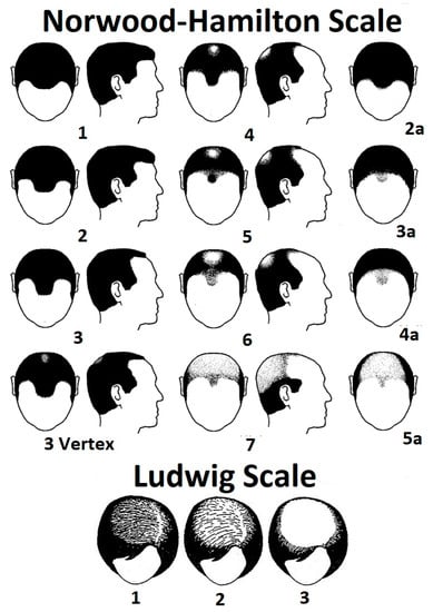 The gradings of androgenetic alopecia in both men and women. Numbers correspond to grading of baldness.