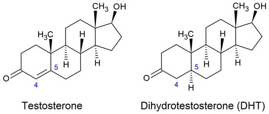 The structures of testosterone versus dihydrotestosterone (DHT).