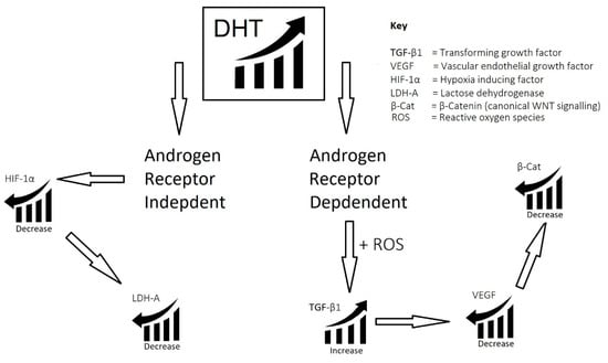 DHT is an agonist of the androgen receptor. It independently promotes the expression of genes that code for factors and enzymes that inhibit and degrade HIF-1α. Furthermore, the increased expression of TGF-β1 is dependent on the presence of reactive oxygen species.