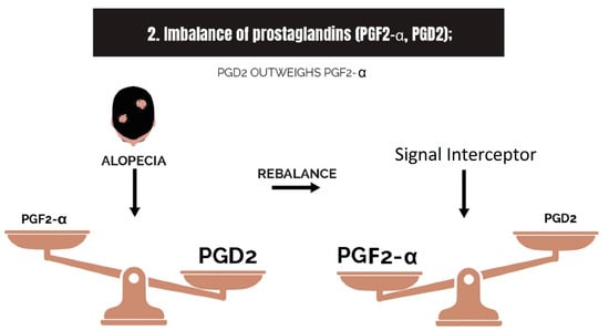 As the hair follicles start to miniaturize in balding scalps, the bulb cells (dermal papilla cells) express higher amounts of prostaglandin D2 (PGD2) [73] relative to prostaglandin F2-α (PGF2-α) (Figure 6). This theoretically occurs prior to the development of fibrosis, a process that becomes more active when TGF-β1 activity from the dermal fibroblasts increases [62].