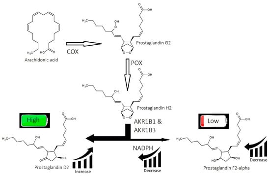 Prostaglandin biosynthesis is dependent upon aldo-keto reductase isotypes (AKR1B1, AKR1B3, or AKR1C3) as synthases. Aldo-keto reductase isotypes catalyze the conversion of PGH2 to PGF2-α in the presence of the reducing agent nicotinamide adenine dinucleotide phosphate (Figure 7) (NADPH) [89,90]. In the absence of NADPH, PGD2 is produced instead by using the same synthases [89].