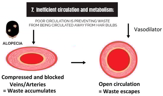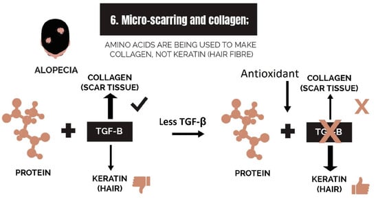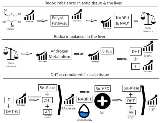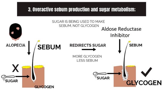 Evidence that monosaccharide metabolism is dysregulated comes from transcriptome profiling of a bald scalp. Changes to the expression of genes demonstrated that a redox imbalance in the mitochondria of dermal papilla cells (NADPH < NADP+) [91] may be linked to overactive aerobic respiration [100]. In the same study, it was realized that antioxidant genes are also upregulated, which reinforces the finding that the metabolism of glucose is generating reactive oxygen species (free radicals) at a rate that is damaging to the hair follicle’s cells and cellular organelles.