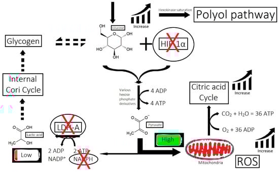 The problems with hair follicle glucose metabolism may be due to the decreased expression of HIF-1α, activation of the polyol pathway, and the inability of the pilosebaceous unit to generate glycogen stores and modulate between mitochondrial respiration and anaerobic glycolysis.