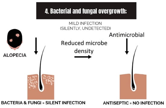 The only type of alopecia that is known to be entirely a consequence of microbial infection is tinea capitis. This fungal infection is more common in children and occurs via transmission and overgrowth of Trichophyton tonsurans [18]. In early cases, hair loss is reversible, but in chronic infections, it becomes a scarring condition, and the hair follicles are replaced with collagenous tissue. Tinea capitis is treated with antimicrobial therapy.