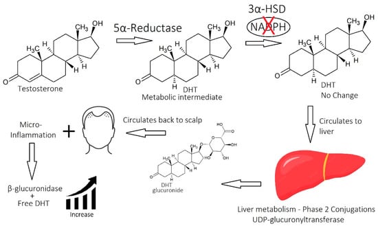 Androgen imbalance is one of the most important abnormalities contributing to AGA (Figure 4). The specific androgen in question is DHT, which is produced from testosterone when the enzyme 5α-reductase reduces it. People who live with AGA have an increased expression of this enzyme in scalp tissue, as well as a higher number of androgen receptors, also known as DHT receptors. DHT binds to the androgen receptor with a five-fold greater affinity than testosterone, making it a more potent androgen. Thus, the androgen imbalance in balding scalps (Figure 5) will cause the over-expression of androgen-responsive genes. Some authors have coined this as ‘intrafollicular androgen overactivity’ [70].