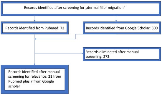 We performed research on the literature through Pubmed and Google Scholar. Inclusion criteria were observational studies, case reports, and clinical trials which investigated the association of facial filler injections to filler migration. Animal studies have not been considered. The search string, designed to cover the primary themes of the review and optimized for high sensitivity, was (dermal fillers [Title/Abstract] OR AND (facial esthetics [Title/Abstract] AND migration [Title/Abstract] OR filler migration [Title/Abstract]. Exclusion criteria were intravascular injection, acute displacement, vascular compromise, and infection. The identified articles were included for further analysis if the title or the abstract showed the matching keywords. We decided not to specify a year range for the selection of articles. The articles were excluded if they contained only abstracts, and were not in the English or German language. Papers published in conferences, books, or book chapters were also excluded. We also searched further from the references of the articles which showed our area of concern (Figure 1).