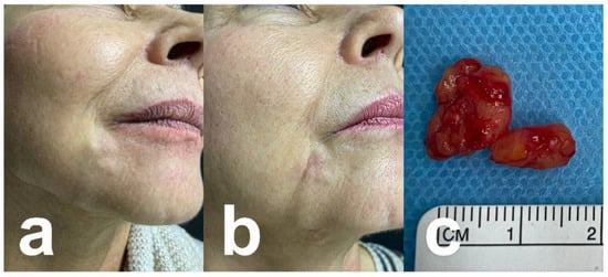 We have recently described a combined technique of neodymium (Nd)-YAG laser application followed by minor surgery to remove PMMA particles avoiding extensive surgery, even in such delicate localizations such as the nose and the lips (Figure 2, Figure 3, Figure 4 and Figure 5) [93,94]. The laser energy is released intralesional using a 300–600 µm blunt fiber embedded in a micro-cannula. The skin temperature is controlled during the procedure to prevent burning. The laser energy causes fragmentation of PMMA particles, which can subsequently be removed by a blunt suction cannula with negative pressure. Satisfaction with this procedure was high.