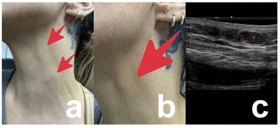40-year-old women with subcutaneous nodules on the neck 4 months after injections of PDLLA into middle and lower face by a beautician (red arrows). Intralesional corticosteroids applied by the beautician did not improve the nodules but caused localized skin atrophy. (a) Overview. (b) Detail. (c) Doppler ultrasound showing the subcutaneous nodule but excluding lymphadenopathy.