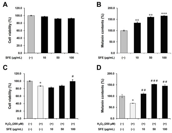 HeMn-MP were seeded in the same way as described in the melanin contents assay section. After seeding, they were exposed to 10 to 150 µg/mL of SFE for 6 h before H2O2 treatment. After 200 µM of H2O2 was added to each well, the cells were incubated with H2O2 for 5 days. Cell viability and melanin contents were measured using the same method as described in the previous section.