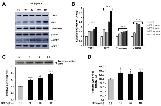Additionally, the cellular tyrosinase levels were measured to confirm the effect of SFE on enzyme activity. As shown in Figure 2D, relative cellular tyrosinase activity was increased about 29.6%, 25.7%, and 35.4% after treatment with 10, 50, and 100 µg/mL of SFE, respectively. These results clearly demonstrated that tyrosinase activity was induced by SFE. It was noteworthy that SFE significantly increased tyrosinase activity even at 10 µg/mL, the lowest concentration used in this study.