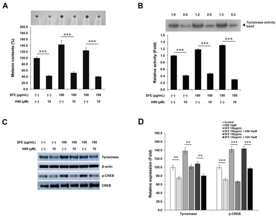 In addition, the effect of SFE treatment with H89 on cell tyrosinase was confirmed via zymography (Figure 3B). The cells were pretreated with H89 for 1 h. They were then treated with SFE for 3 days. The activity of cellular tyrosinase was confirmed on bis-tris gel via zymography. With the same tendency as melanin content, tyrosinase activity was decreased by about 0.4-fold after treatment with H89 compared to the control group. However, treatment with 100 µg/mL and 150 µg/mL of SFE increased the tyrosinase activity by 1.2-fold and 1.3-fold, respectively. When PKA was inhibited by H89 treatment, tyrosinase activity decreased by 0.5-fold and 0.4-fold, respectively.