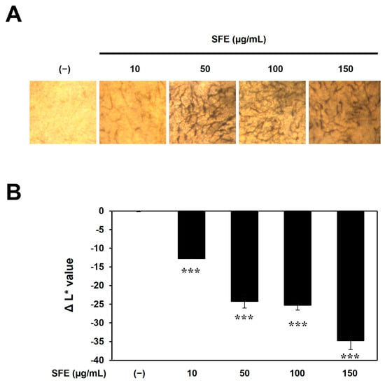 To confirm the effect of SFE on melanogenesis in an equivalent condition of human skin, a reconstituted three-dimensional human skin, KeraSkin-M™ (BioSolution, Seoul, Republic of Korea) containing normal epidermal keratinocytes and melanocytes, was incubated with SFE (10, 50, 100, and 150 µg/mL) for 14 days. As shown in Figure 4A, when 3D skin treated with SFE was observed through a microscope, it was confirmed that more melanocytes were distributed in the SFE-treated group compared to those in the untreated control.