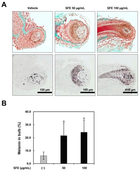 After ex vivo hair follicles were treated with 50 or 100 µg/mL of SFE for 9 days, melanin content was evaluated using Fontana–Masson staining, and the amount of melanin in the hair bulb and shaft area was observed microscopically (Figure 5A). After treatment with 50 or 100 µg/mL of SFE, the melanin content was significantly increased compared with that in the untreated control (Figure 5B).