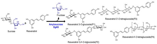 Representative reaction scheme of resveratrol glucoside formation by the enzyme DgAS, amylosucrase.