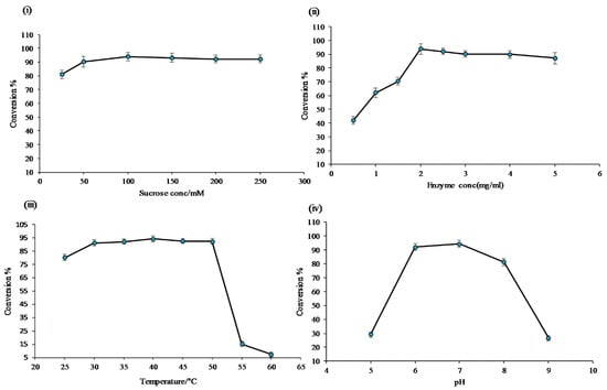 Conversion percentage of resveratrol to resveratrol glucosides in the optimization cascade reaction; (i) variation of sucrose concentration; (ii) different enzymes concentration of DgAS; (iii) variation of reaction temperature; and (iv) variation of buffer and pH.