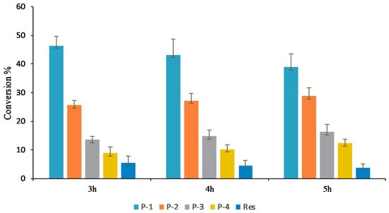 When product profiles at different time points were analyzed, four distinct peaks were initially observed. Among them, the peak at tR 13.01 min (P1) was initially the most dominant. However, with increasing the incubation time from 3 h, to 4 h, to 5 h, peaks at tR 12.56 min (P2), 12.03 min (P3), and 11.80 min (P4) gradually increased, while that of P1 gradually decreased. The conversion of resveratrol to its glucosides was found to increase more significantly with an increasing incubation period in the large-scale reactions (Figure 4 and Figure S6). Based on the nature of product formation, the amount of the desired products can be controlled by changing the incubation period of the reaction. As time increased, the mono-glycosylated products changed into di-glycosylated or poly-glycosylated products. The overall conversion of the resveratrol to its glucosides was about 97.0%. The calculated conversion rates for regular products of P1, P2, P3, and P4 at 5 h were 38.8, 28.8, 16.2, and 12.3%, respectively (Figure 4).