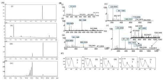 (A) HPLC analysis of resveratrol reaction mixture: (i) control reaction for regular glycosylation reaction of DgAS; (ii) standard resveratrol; and (iii) regular glycosylation reaction carried out using DgAS. (B) UV-VIS analysis of each major peak from HPLC: (i) standard resveratrol; (ii) P1; (iii) P2; (iv) P3; and (v) P4. (C) HRQTOF-ESI/MS analysis of (i) resveratrol standard; (ii) product P1; (iii) product P2; (iv) product P3; and (v) product P4.