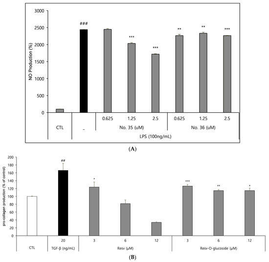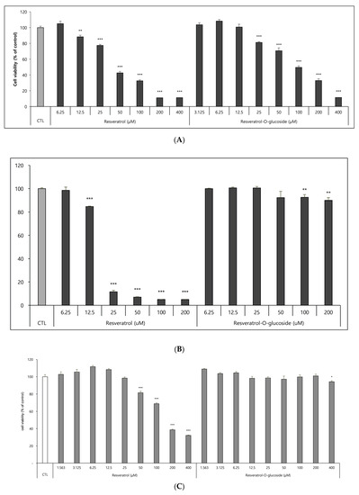 Cytotoxicity: Raw 264.7 cells, macrophage cell line, were seeded into 96-well culture plates at a density of 1.0 × 104 cells/well. After 24 h, the cells were treated with resveratrol and resveratrol-O-glucoside, at indicated concentrations, in a medium containing 10.0% fetal bovine serum (FBS; Gibco, Thermo Fisher, Waltham, MA, USA) for 48 h. HS68 cells (human fibroblast cells) were seeded into 96-well culture plates at a density of 0.5 × 104 cells/well. After 24 h, the cells were treated with resveratrol and resveratrol-O-glucoside, at various concentrations (1.563–400 μM) in a medium containing 2.0% of FBS (Samchun, Pyeongtaek-si, Republic of Korea) for 48 h. B16 cells, a mouse melanoma cell line, were seeded into 96-well culture plates at a density of 8.0 × 103 cells/well and cultured overnight. The cells were then treated with resveratrol and resveratrol-O-glucoside, at various concentrations, in a medium containing 5.0% bovine serum (FBS; ATCC, Manassas, VA, USA) and a 1% penicillin-streptomycin mixture (PS’ Lonza, Basel, Switzerland) for 72 h.