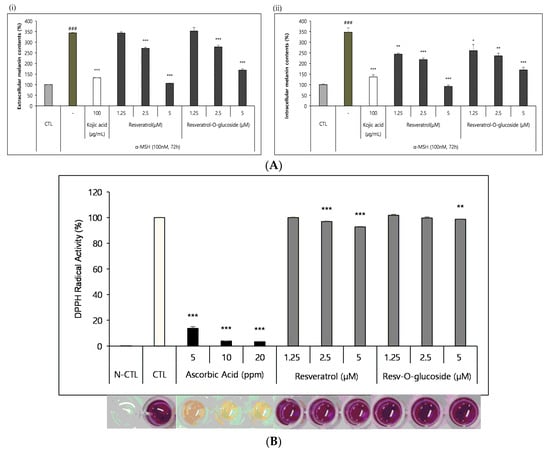 Whitening and antioxidant tests of raw resveratrol and resveratrol-O-glucoside. (A) (i) extracellular melanin contents (%), and (ii) intracellular melanin contents (%). Experimental conditions: B16/25 × 103 cells/48-well plate/72 h incubation period after sample treatment. Note: media containing 5% ATCC FBS was used for cell culture. The stimulus is α-MSH, and the positive control is Kojic acid (a functional whitening ingredient). The inhibition of melanogenesis was calculated as CTL (100%, α-MSH alone (0%)). Significance is indicated only when there is a whitening effect. *** or ###; p < 0.001/**; p < 0.01/*; p < 0.1. (B) Experimental conditions: DPPH test B16/8 × 103 cells/96-well plate, 15 min incubation after sample treatment. Note—The experimental concentrations were specified considering non-toxic concentrations in both Raw 262.47, HS68, and B16 cells. Significance is shown only when there is an antioxidant advantage over CTL ***; p < 0.001/**; p < 0.01.